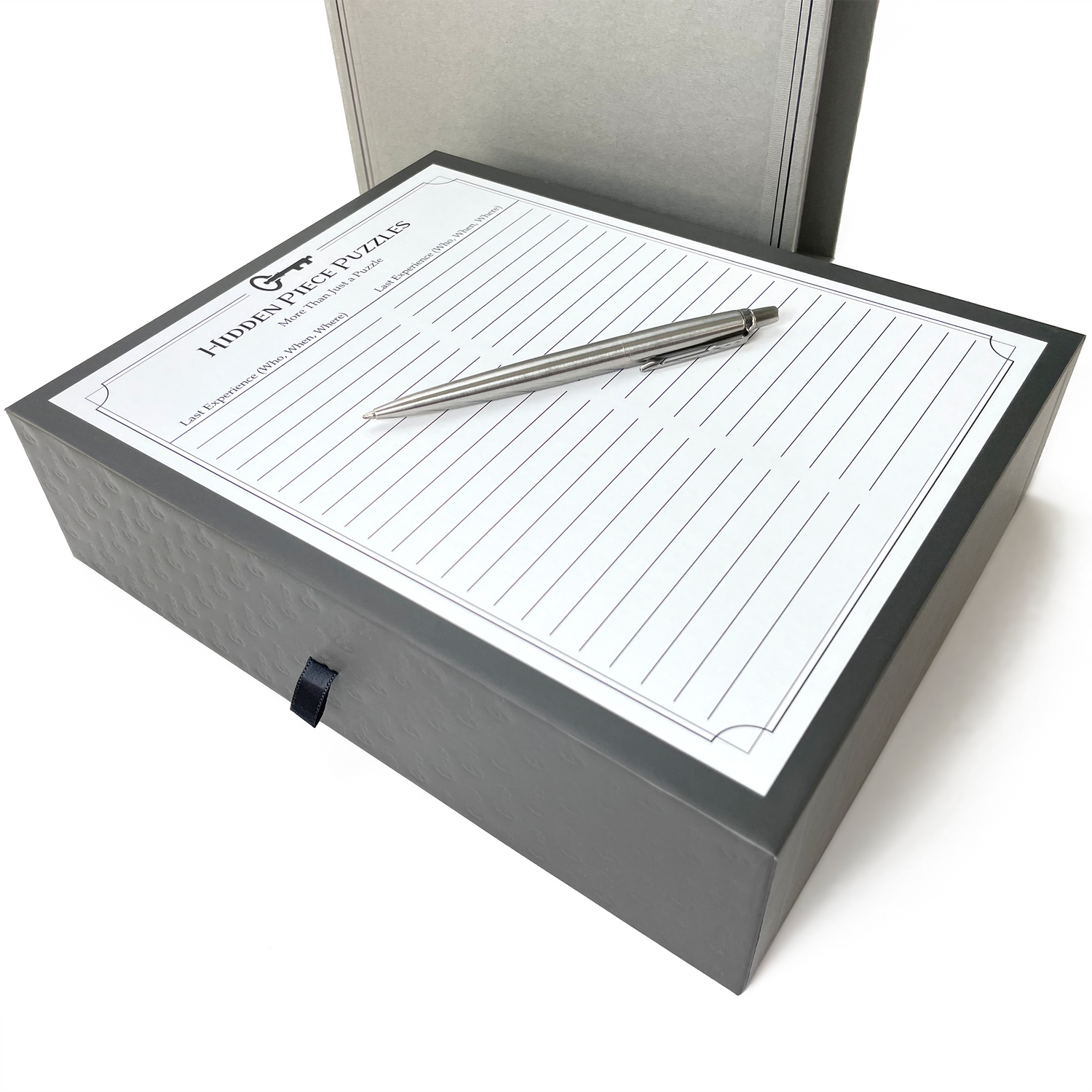 Our puzzles are meant to collect memories and be passed down generations. We have provided a place on back of the drawer portion of our medium/large puzzle box to keep track of your memories for each experience you have putting together our puzzles (Who, When, Where). We hope this makes having it as a family heirloom more meaningful.